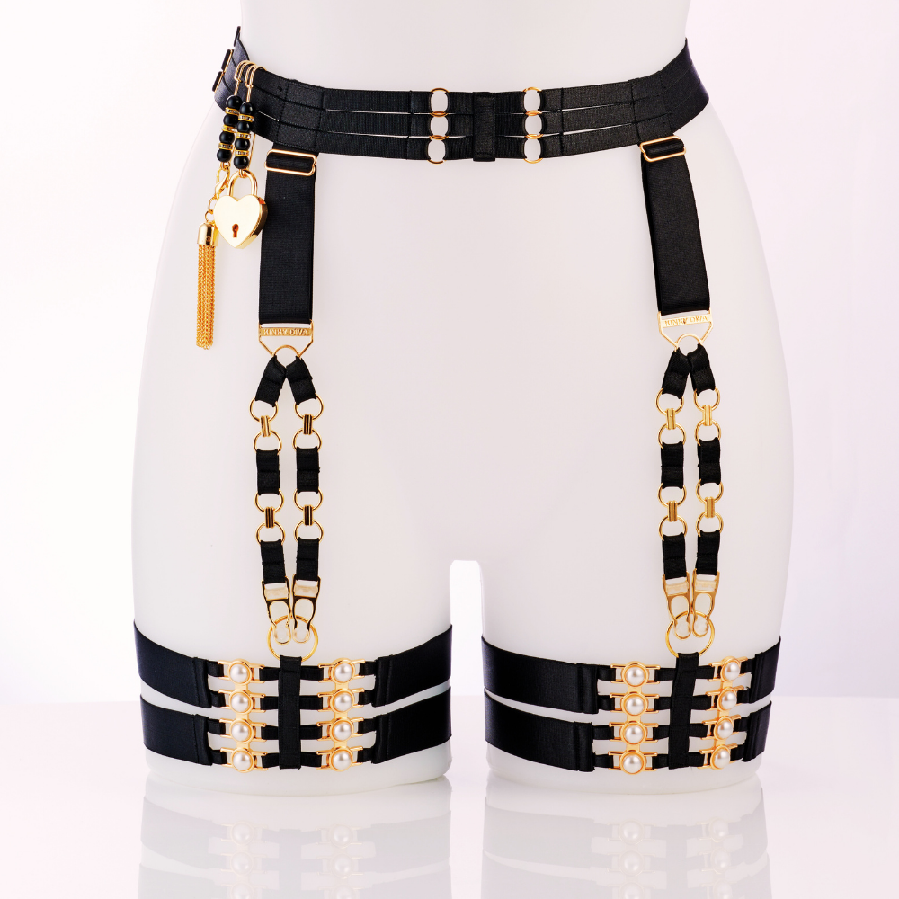 ISIS II | 16 PEARLS – Suspender Belt / Thigh Garters 4 Clips A seductive piece of art that shows elegance in combination with amazing luxury datails. Featuring four clips, this suspender belt keeps the thigh garters perfectly in place while enhancing your silhouette. Accented with 16 pearls in a golden setting, a touch of sophistication is not to be missed. Adjustable for comfort and fit, it’s the perfect blend of style and allure.